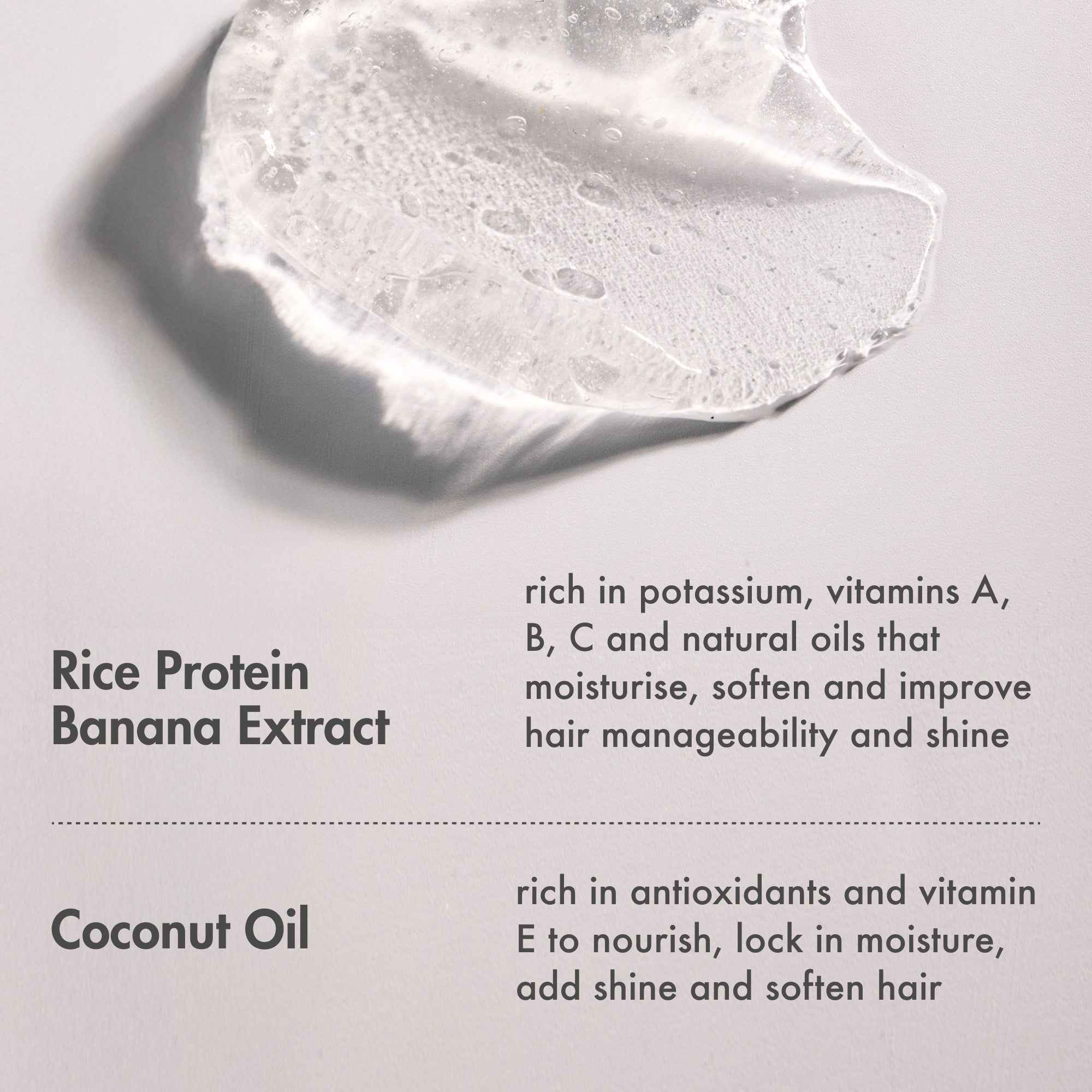 • Infused with Banana extracts & Rice Protein to moisturise strands, strengthen and improve shine
