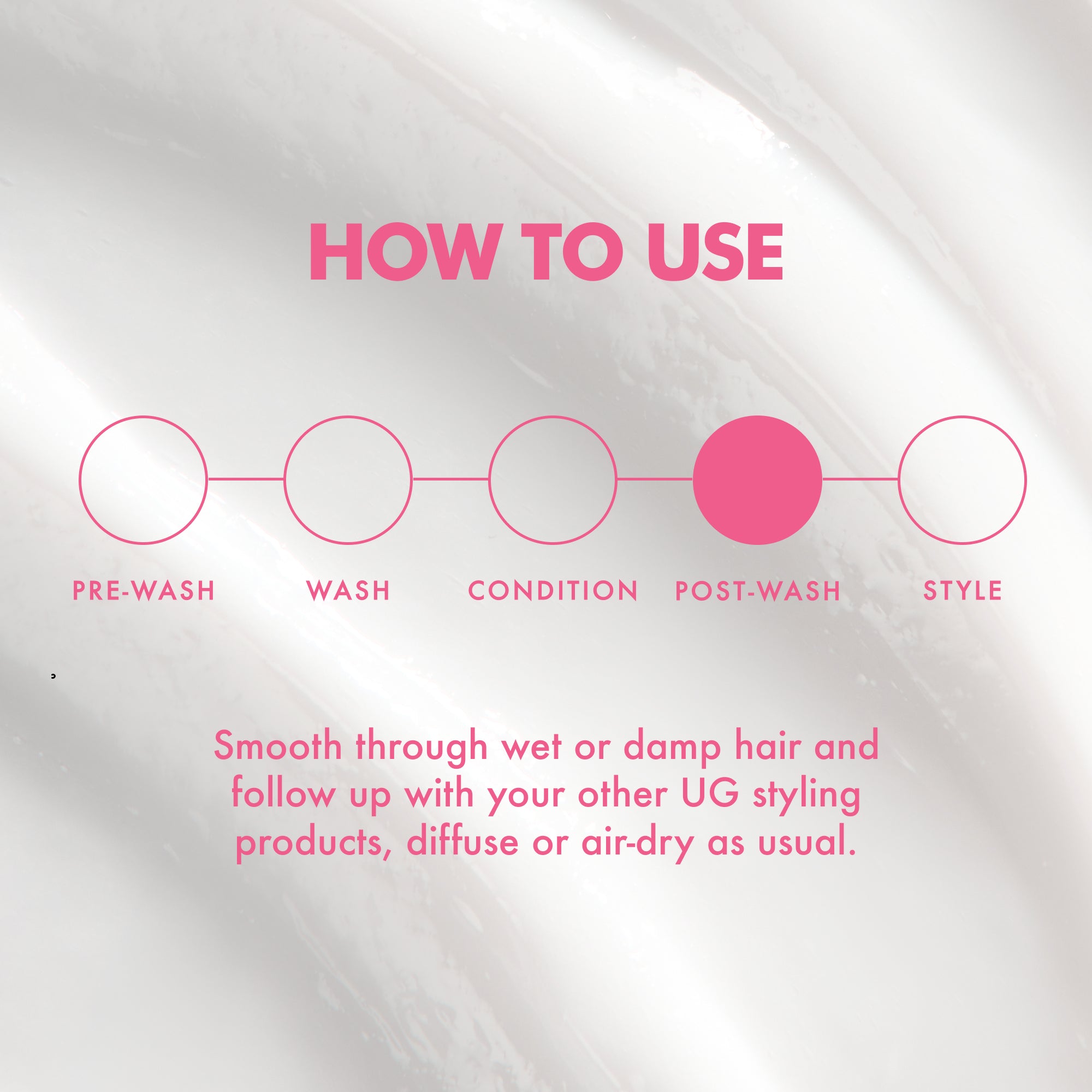 Smooth through wet or damp hair and follow up with your other UG styling products, diffuse or air-dry as usual.